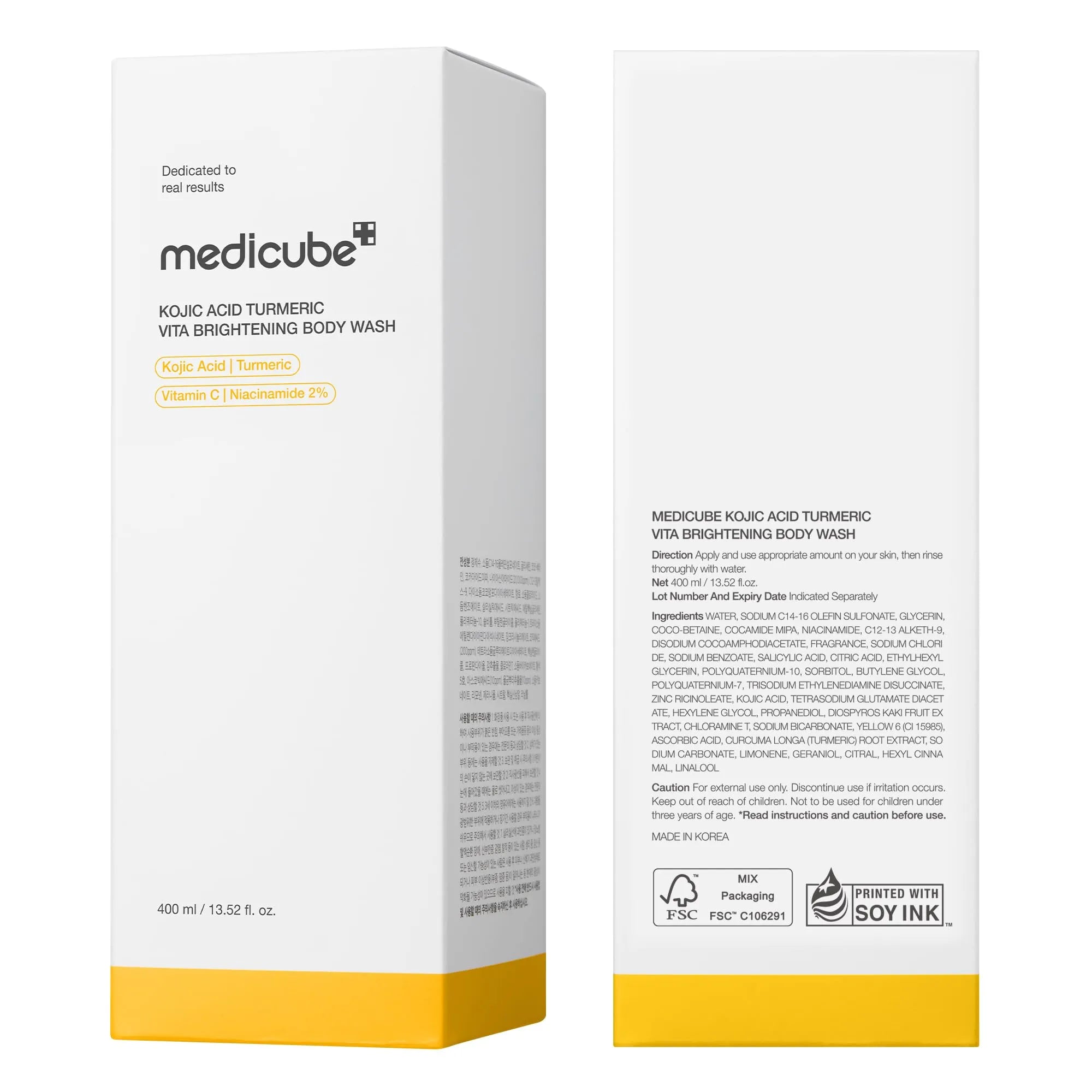 The MEDICUBE Kojic Acid Turmeric Vita Brightening Body Wash (400ml) is a dermatology-inspired body cleanser designed to visibly improve skin tone, clarity, and smoothness while cleansing gently. Powered by Kojic Acid and Turmeric Extract, this formula helps reduce the appearance of dullness, uneven tone, and dark areas caused by sun exposure or dryness.